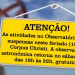 Atividades no Observatório estão suspensas no feriado de Corpus Christi