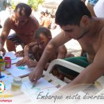 A equipe de recreação estimulou a imaginação dos alunos com a proposta de desenhar com tinta guache. Essa brincadeira não é a única atividade desenvolvida pela recreação do Parque Aquático, as atividades variam, mas são realizadas gincanas, desafio no slackline, corrida no tatame, dança, entre outras.