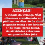 O Complexo Turístico Cidade da Criança não realizará atendimento ao público neste feriado, (1°), Dia do Trabalhador. O Parque Ecológico estará fechado para visitação e retornará normalmente na quarta-feira, (02), das 9h às 17h, a entrada é gratuita.